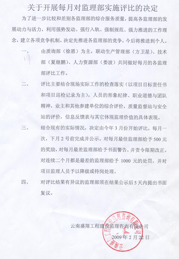 關(guān)于開(kāi)展每月對(duì)監(jiān)理部實(shí)施評(píng)比的決定