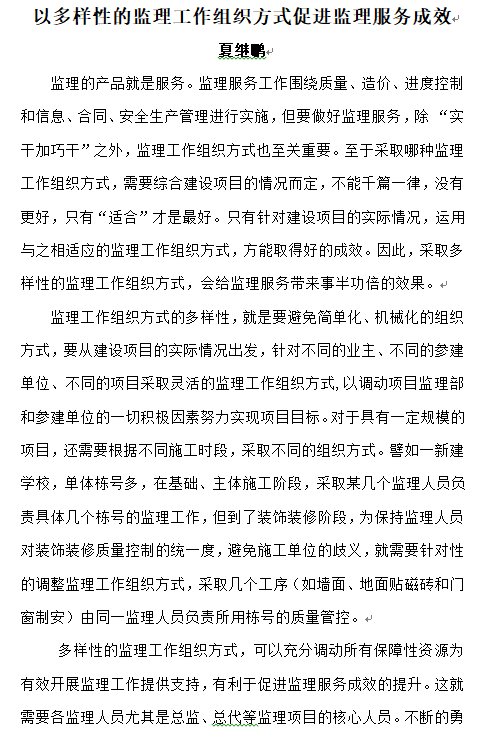 以多樣性的監(jiān)理工作組織方式促進(jìn)監(jiān)理服務(wù)成效——夏繼鵬