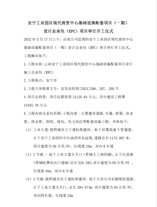 安寧工業(yè)園區(qū)現(xiàn)代商貿(mào)中心基礎(chǔ)設(shè)施配套項目(一期) 設(shè)計總承包(EPC)項目舉行開工儀式