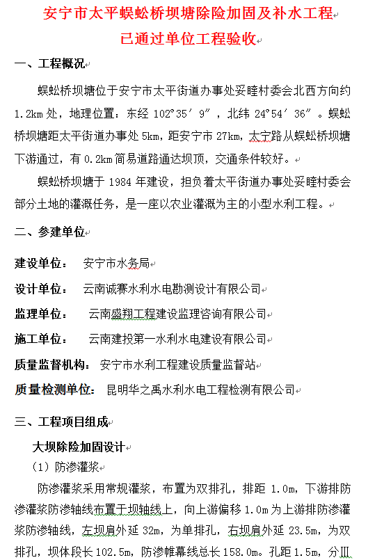 安寧市太平蜈蚣橋壩塘除險加固及補水工程 已通過單位工程驗收