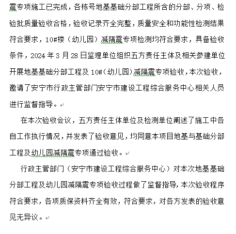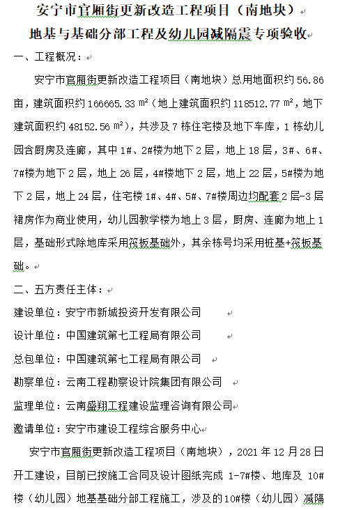 安寧市官廂街更新改造工程項目(南地塊) 地基與基礎(chǔ)分部工程及幼兒園減隔震專項驗收