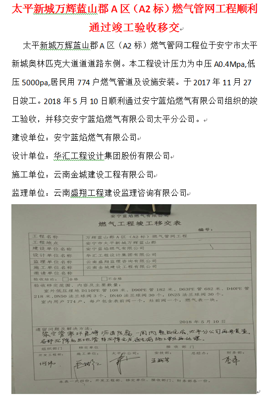 太平新城萬輝藍山郡A區(qū)(A2標)燃氣管網工程順利通過竣工驗收移交
