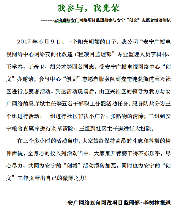 我參與,我光榮(云南盛翔安廣網(wǎng)絡(luò)項目監(jiān)理部參與安寧“創(chuàng)文”志愿者活動側(cè)記)