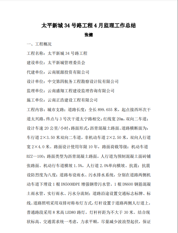 太平新城34號(hào)路工程4月監(jiān)理工作總結(jié)——張健