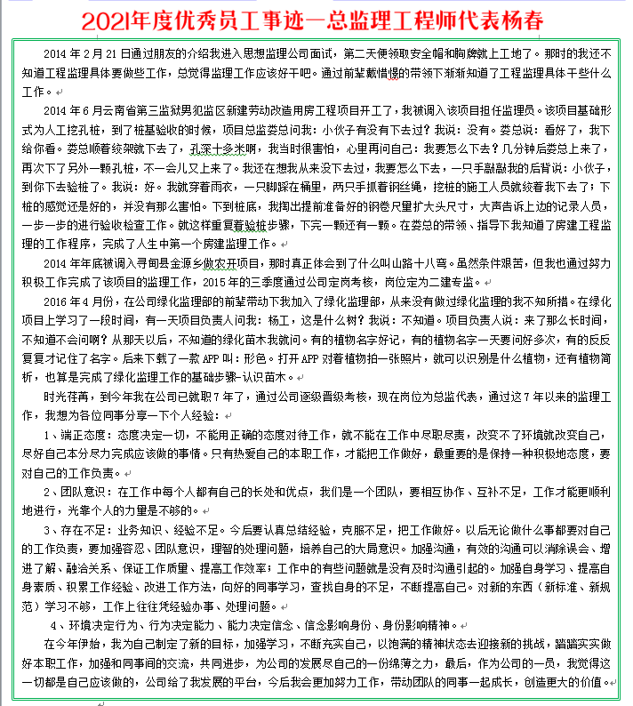 2021年度優(yōu)秀總監(jiān)理工程師代表先進(jìn)事跡——楊春