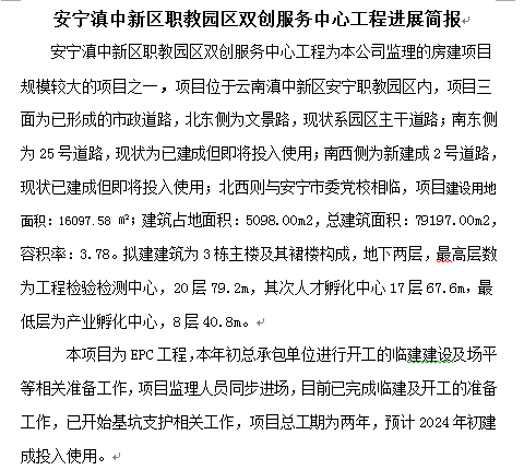 安寧滇中新區(qū)職教園區(qū)雙創(chuàng)服務(wù)中心工程進(jìn)展簡(jiǎn)報(bào)