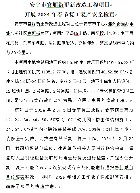 安寧市官廂街更新改造工程項(xiàng)目開展2024年春節(jié)復(fù)工復(fù)產(chǎn)安全檢查