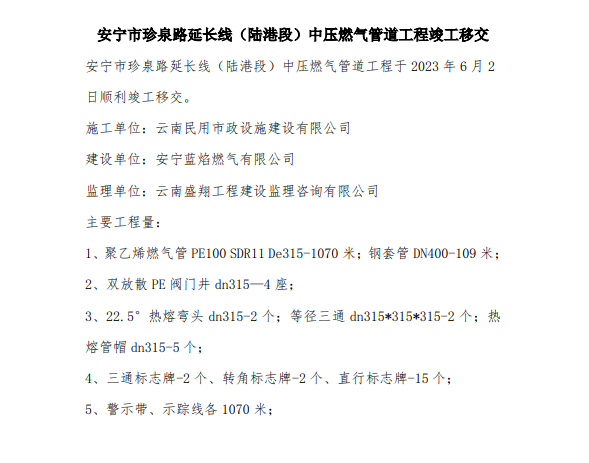 安寧市珍泉路延長線(陸港段)中壓燃?xì)夤艿拦こ炭⒐ひ平?/p>