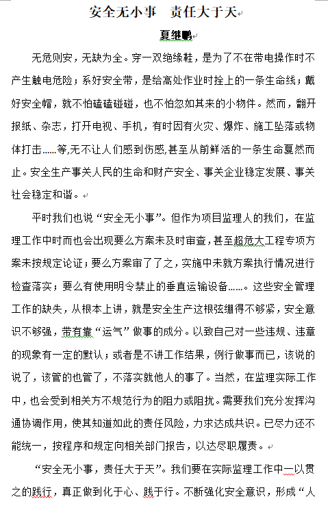 安全無小事 責(zé)任大于天——夏繼鵬