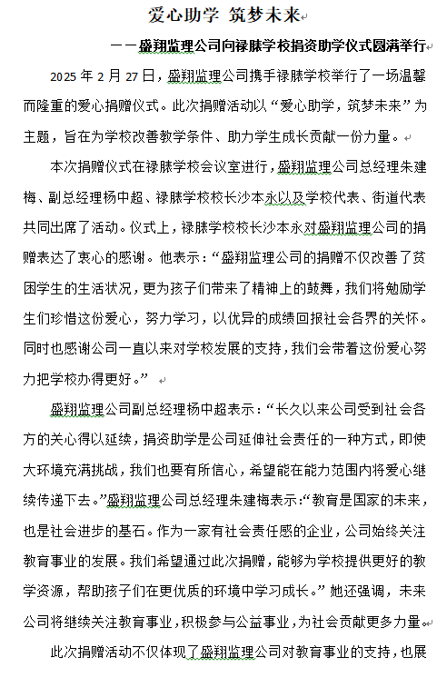 愛(ài)心助學(xué) 筑夢(mèng)未來(lái) ——盛翔監(jiān)理公司向祿脿學(xué)校捐資助學(xué)儀式圓滿舉行