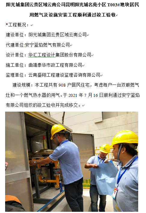 陽光城集團(tuán)云貴區(qū)域云南公司昆明陽光城名苑小區(qū)T003#地塊居民用燃?xì)饧霸O(shè)施安裝工程順利通過竣工驗(yàn)收