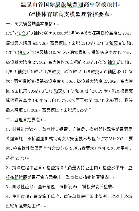 溫泉山谷國(guó)際康旅城普通高中學(xué)校項(xiàng)目 6#樓體育館高支模監(jiān)理管控要點(diǎn)