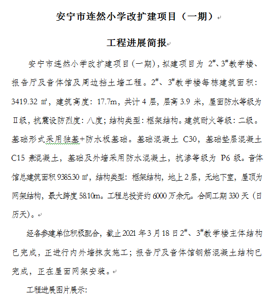安寧市連然小學(xué)改擴(kuò)建項(xiàng)目(一期) 工程3月進(jìn)展簡報(bào)