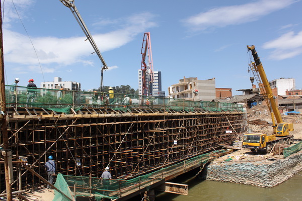 跨螳螂川河新建橋梁為安寧市金色螳川商貿(mào)城中華路向東延長(zhǎng)線其中一段,橋的縱向?yàn)?3米,橋?qū)?0米,橫跨螳螂川河,基礎(chǔ)形式為明挖擴(kuò)大基礎(chǔ)。該工程在建