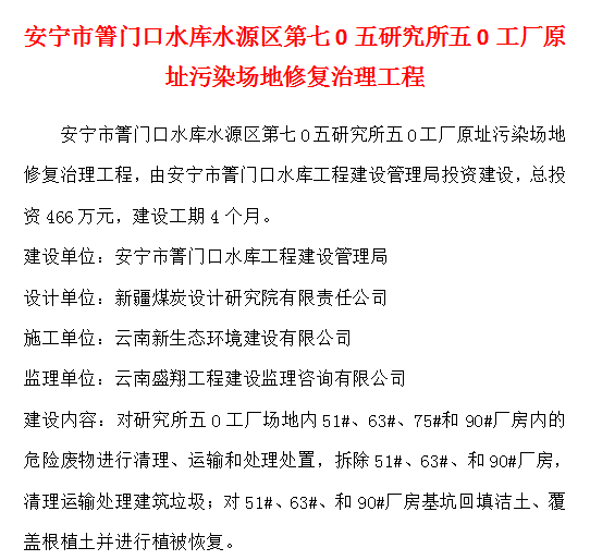 安寧市箐門口水庫水源區(qū)第七0五研究所五0工廠原址污染場地修復(fù)治理工程