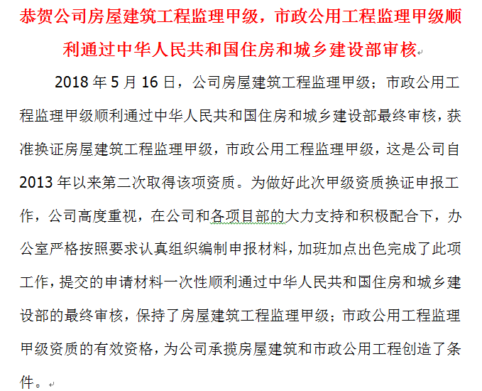 恭賀公司房屋建筑工程監(jiān)理甲級;市政公用工程監(jiān)理甲級順利通過中華人民共和國住房和城鄉(xiāng)建設(shè)部審核