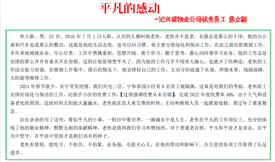 平凡的感動(dòng)——記興城物業(yè)公司優(yōu)秀員工焦立新