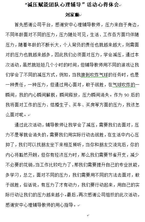 “減壓賦能團(tuán)隊(duì)心理輔導(dǎo)”活動(dòng)心得體會(huì)—— 劉家順