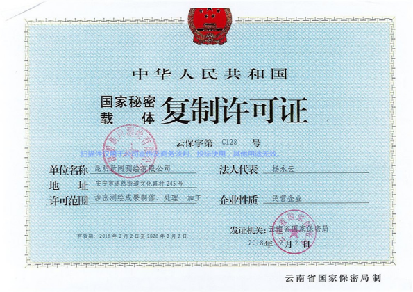公司2005年5月取得云南省測繪局丙級資質(zhì),2014年4月取得國家乙級測繪資質(zhì)證書,證號:乙測資字53100014號,2016年6月取得云南住房和城鄉(xiāng)建設(shè)廳:建設(shè)工程質(zhì)量檢測資質(zhì)證書,證號:建檢字第20150090104號,公司經(jīng)營范圍:地理信息系統(tǒng)工程、工程測量、不動產(chǎn)測繪(房產(chǎn)測繪、地籍測繪)、工程檢測。