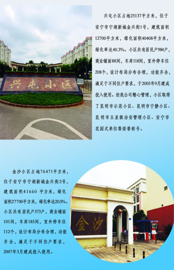公司經(jīng)營范圍:物業(yè)管理、房地產(chǎn)中介、家政服務;五金建材、百貨日用品的批發(fā)零售;洗車、服裝干洗;綠化養(yǎng)護、道路清掃保潔。(依法須經(jīng)批準的項目,經(jīng)相關(guān)部門批準后方可開展經(jīng)營活動),公司物業(yè)管理面積已達85萬平方米,在冊職工196人,管理服務項目有:小區(qū)日常管理、治安管理、設(shè)施設(shè)備維修養(yǎng)護、衛(wèi)生、綠化等服務,接受委托管理的物業(yè)項目有:興屯小區(qū)、興屯二區(qū)、金沙小區(qū)、寶興寧和家園、大屯寧和家園、安瀾雅苑、金成花園、麒麟家園、安寧工業(yè)園區(qū)孵化基地、喜來樂洗車服務部等項目。
