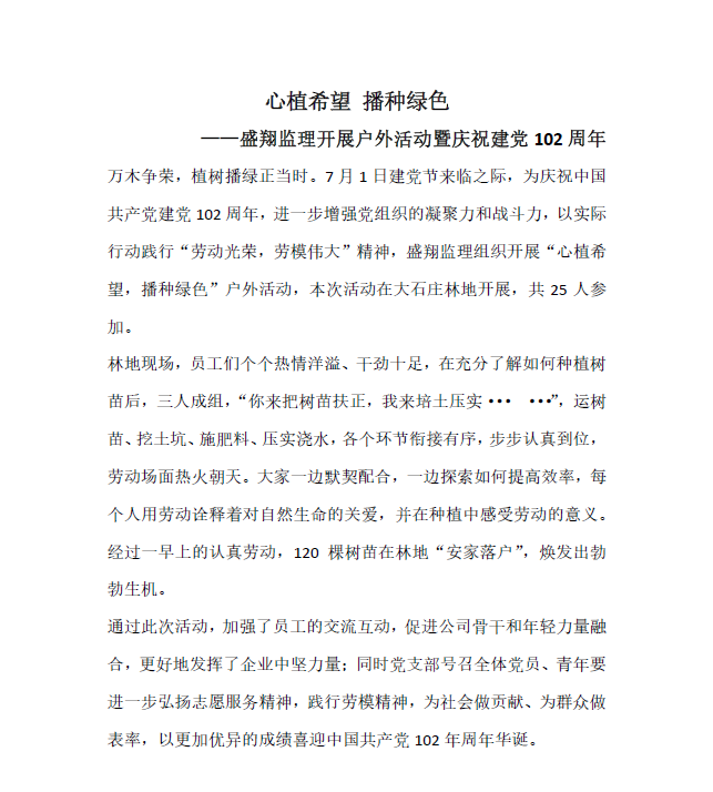 • 心植希望 播種綠色 ——盛翔監(jiān)理開展戶外活動暨慶祝建黨102周年