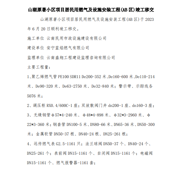 山湖原著小區(qū)項目居民用燃氣及設(shè)施安裝工程(AB區(qū))竣工移交