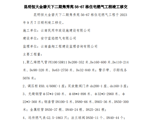 昆明恒大金碧天下二期雋秀苑56-67棟住宅燃?xì)夤こ炭⒐ひ平?/p>