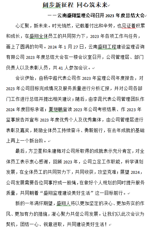 闊步新征程 同心筑未來 ——云南盛翔監(jiān)理公司召開2023年度總結(jié)大會