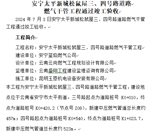 安寧太平新城松鼠屋三、四號路道路 燃?xì)飧晒芄こ掏ㄟ^竣工驗收