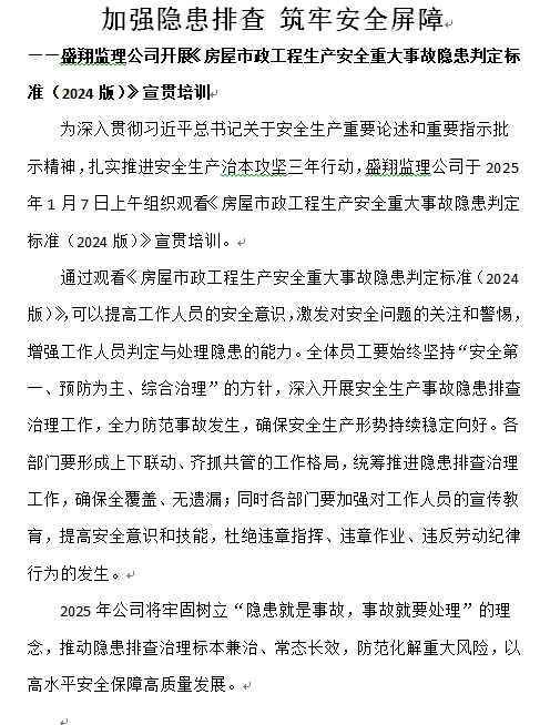 加強(qiáng)隱患排查 筑牢安全屏障——盛翔監(jiān)理公司開展《房屋市政工程生產(chǎn)安全重大事故隱患判定標(biāo)準(zhǔn)(2024版)》宣貫培訓(xùn)