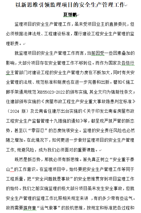 以新思維引領(lǐng)監(jiān)理項(xiàng)目的安全生產(chǎn)管理工作——夏繼鵬