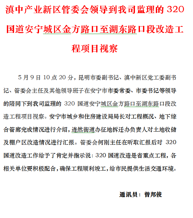 滇中產(chǎn)業(yè)新區(qū)管委會領(lǐng)導(dǎo)到我司監(jiān)理的320國道安寧城區(qū)金方路口至湖東路口段改造工程項目視察